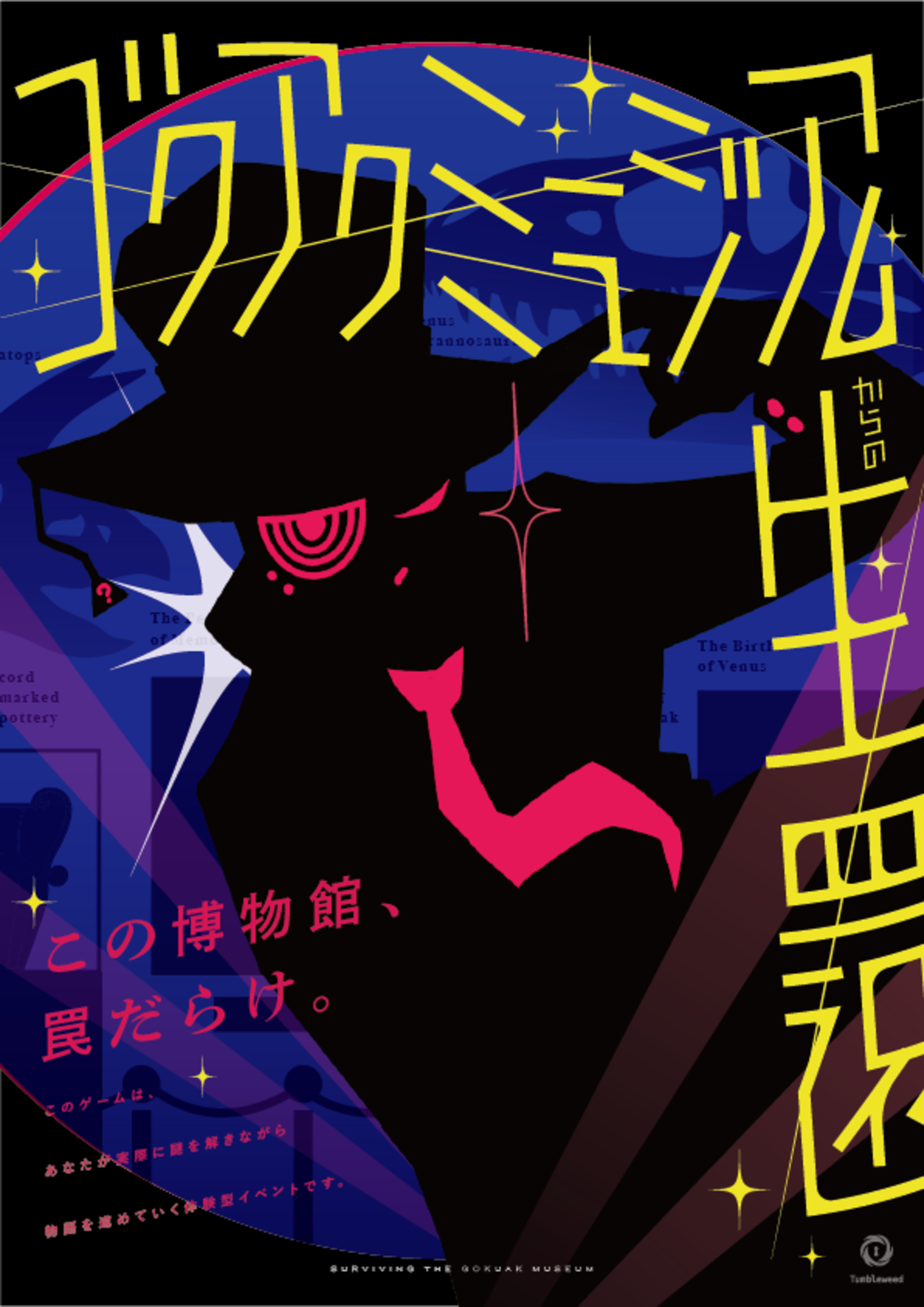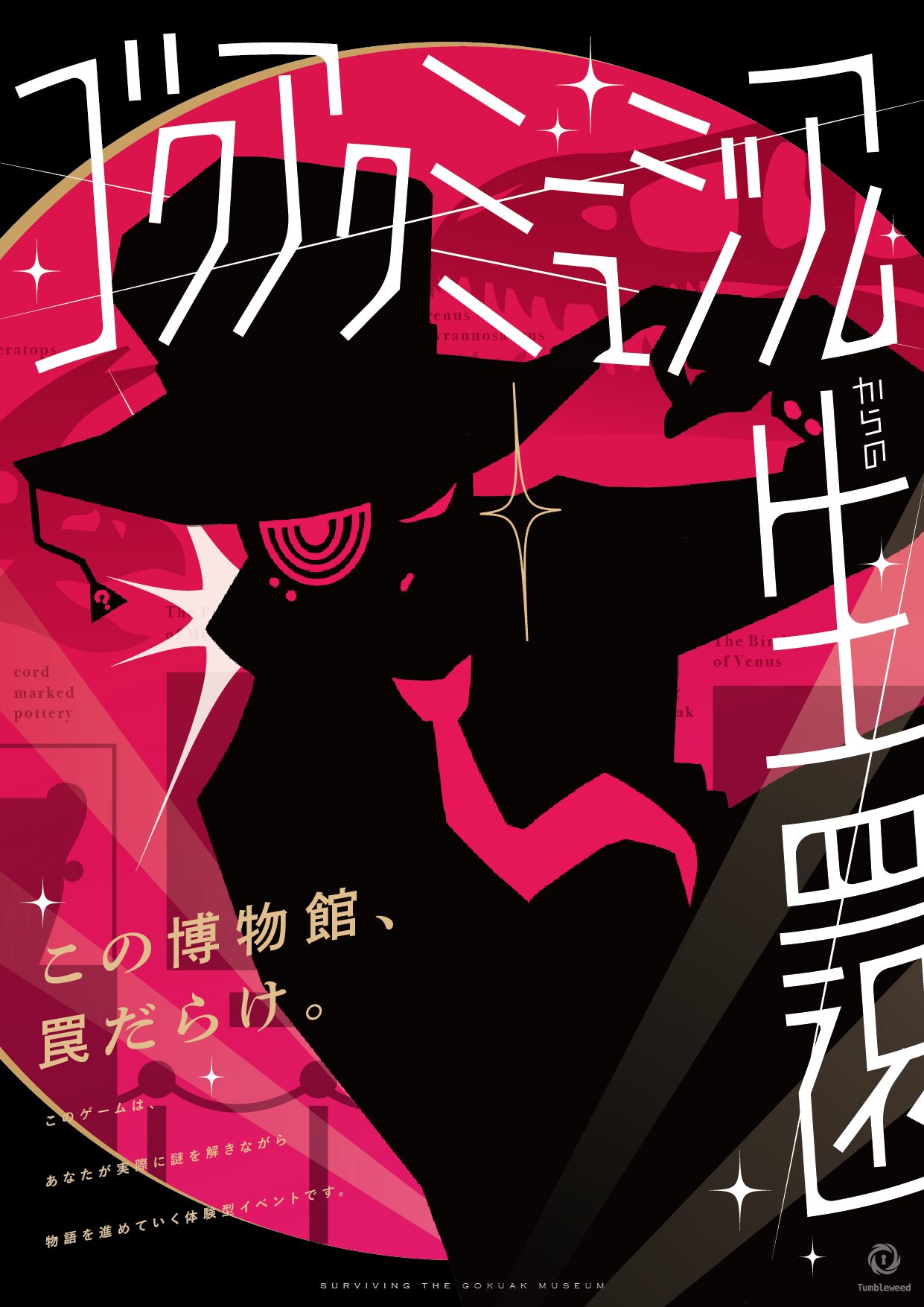 罠だらけの博物館から生還を目指す、ホール型謎解き公演「ゴクアクミュージアムからの生還」。謎解きクリアファイルのビジュアルを担当。2024年夏に初演。