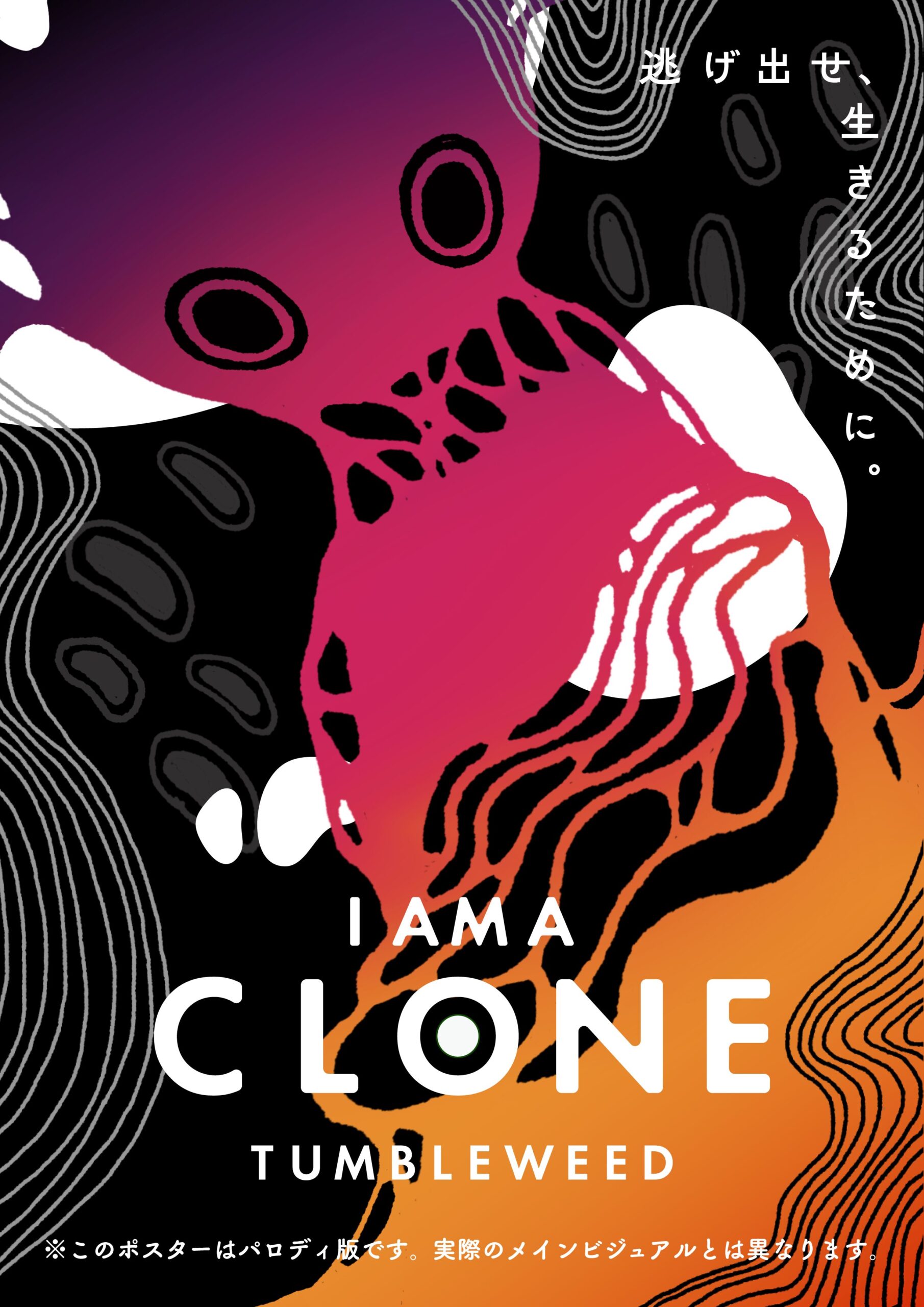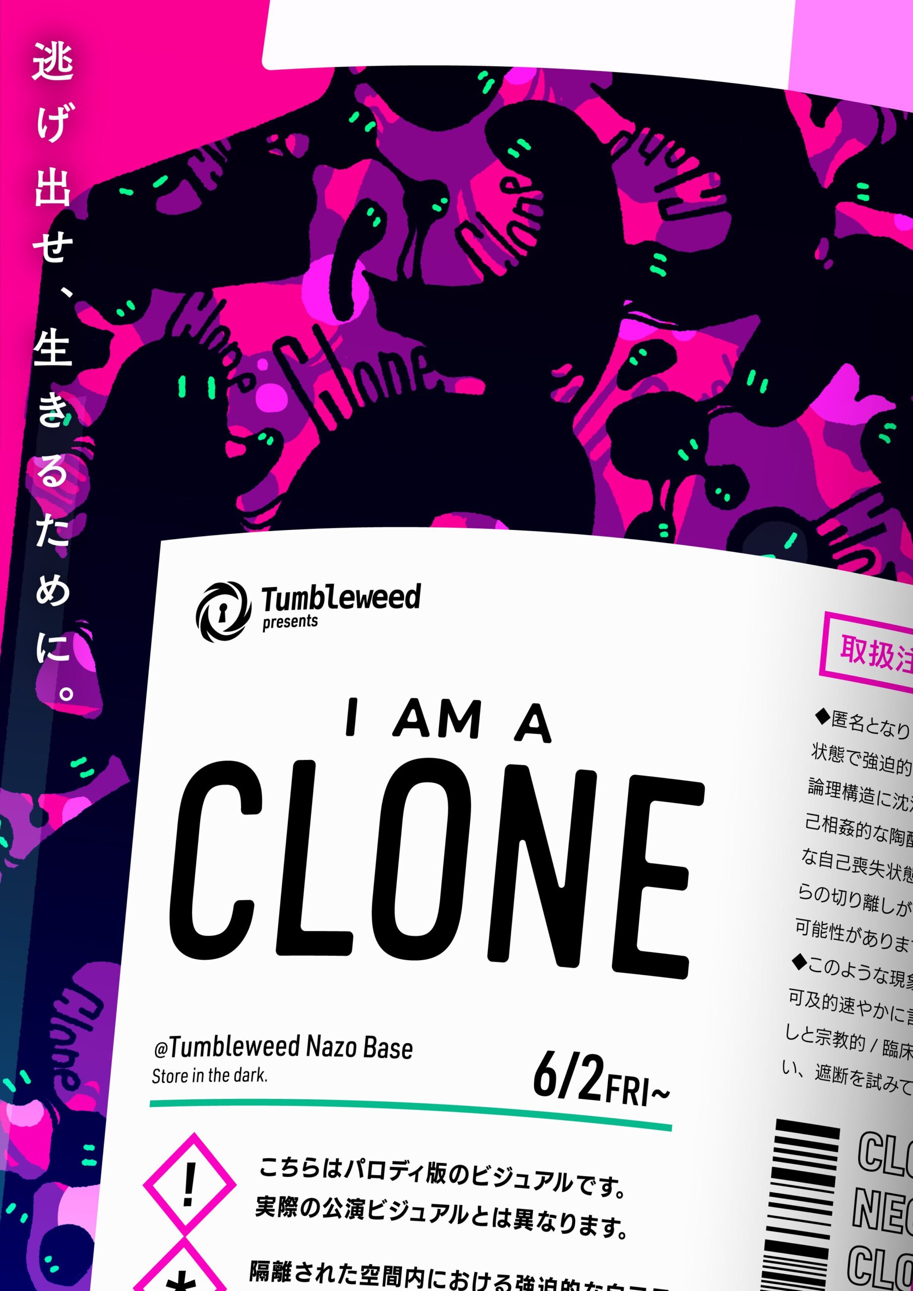 クローンとなって実験施設から脱出を目指す、タンブルウィードによるホール型謎解き公演「I AM A CLONE」。クローンになぞらえ、ツイッター上でパロディ版のビジュアルを公開するキャンペーンが開催されました。2枚のビジュアルを担当。初演は2023年秋。